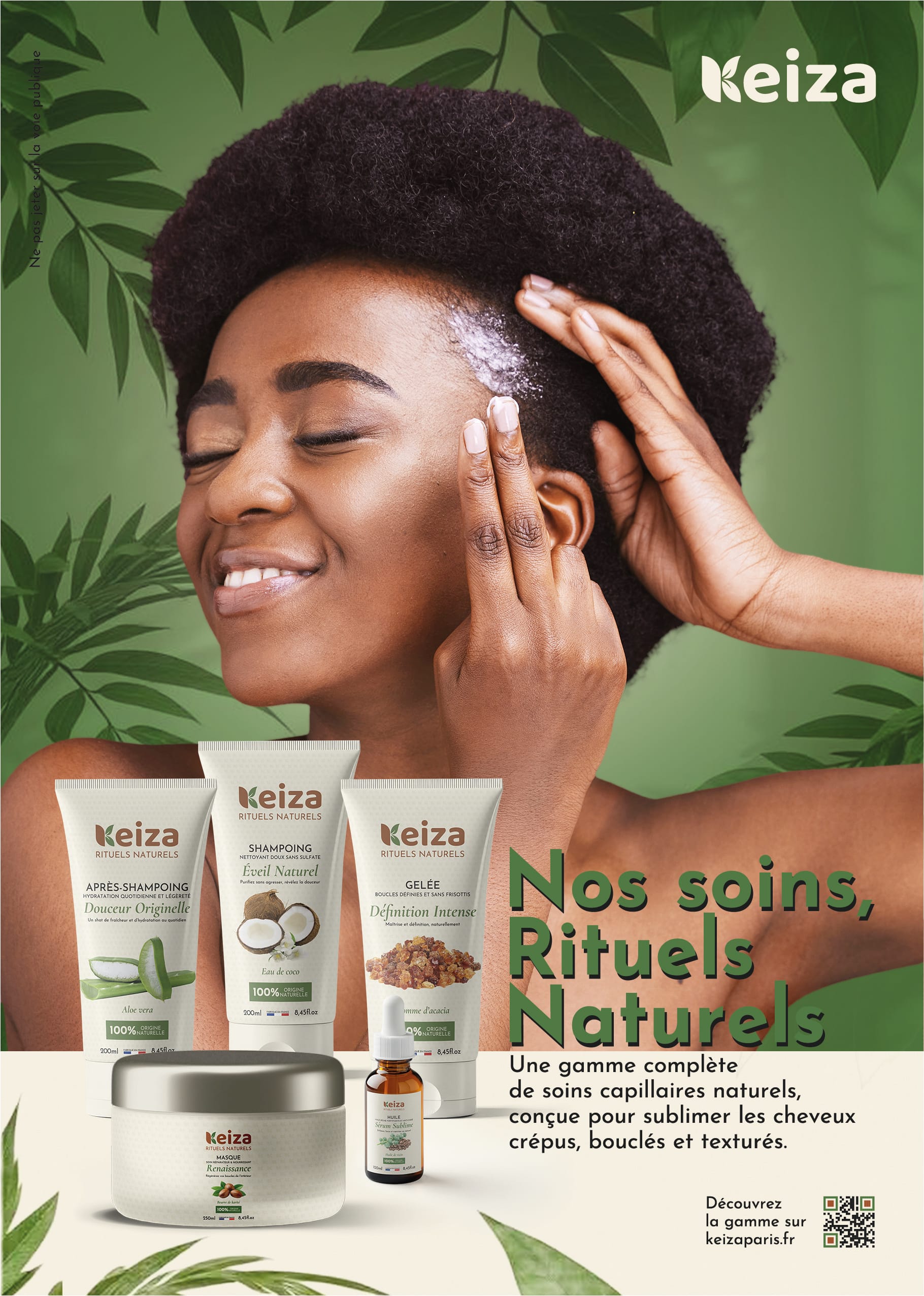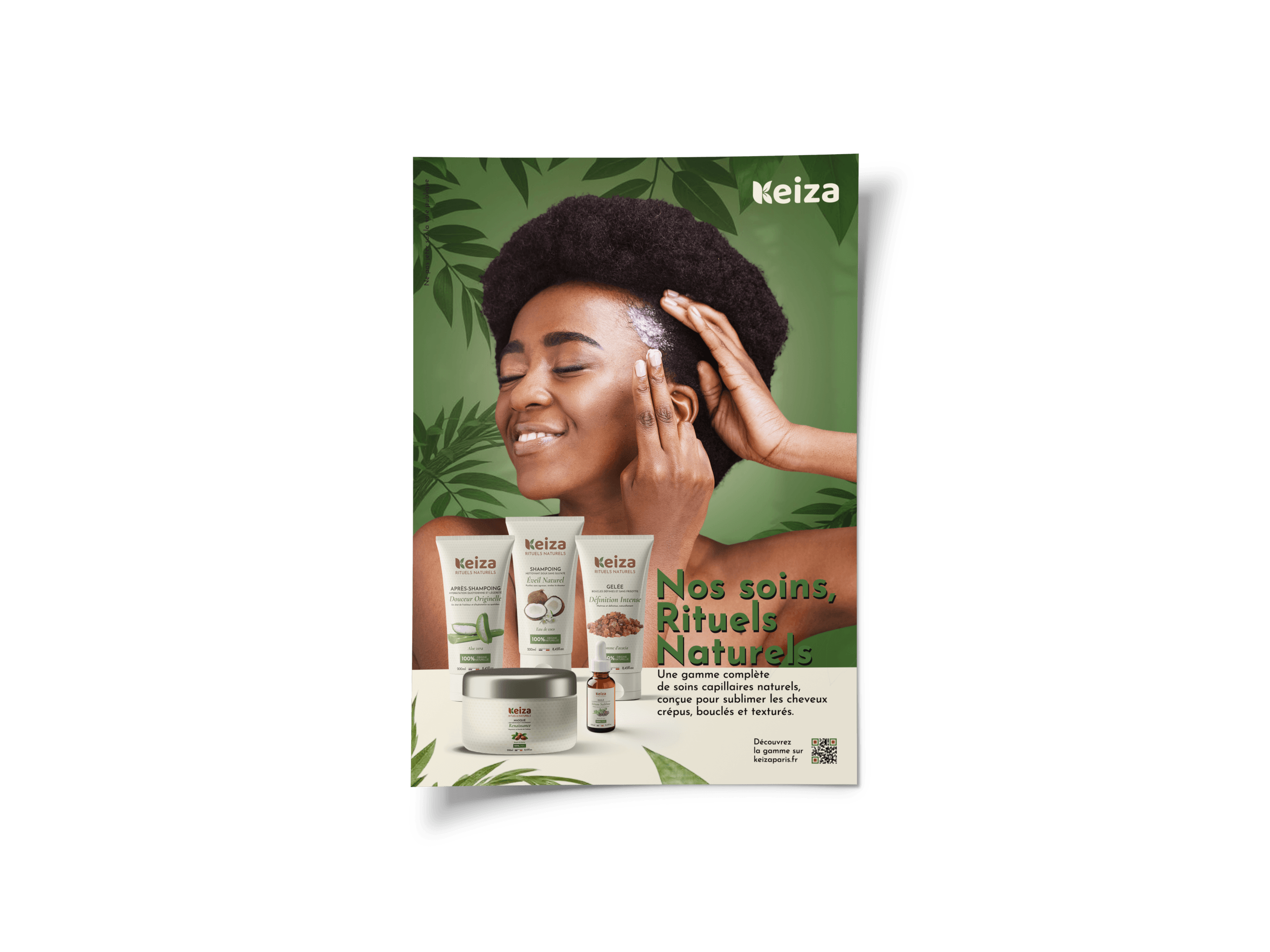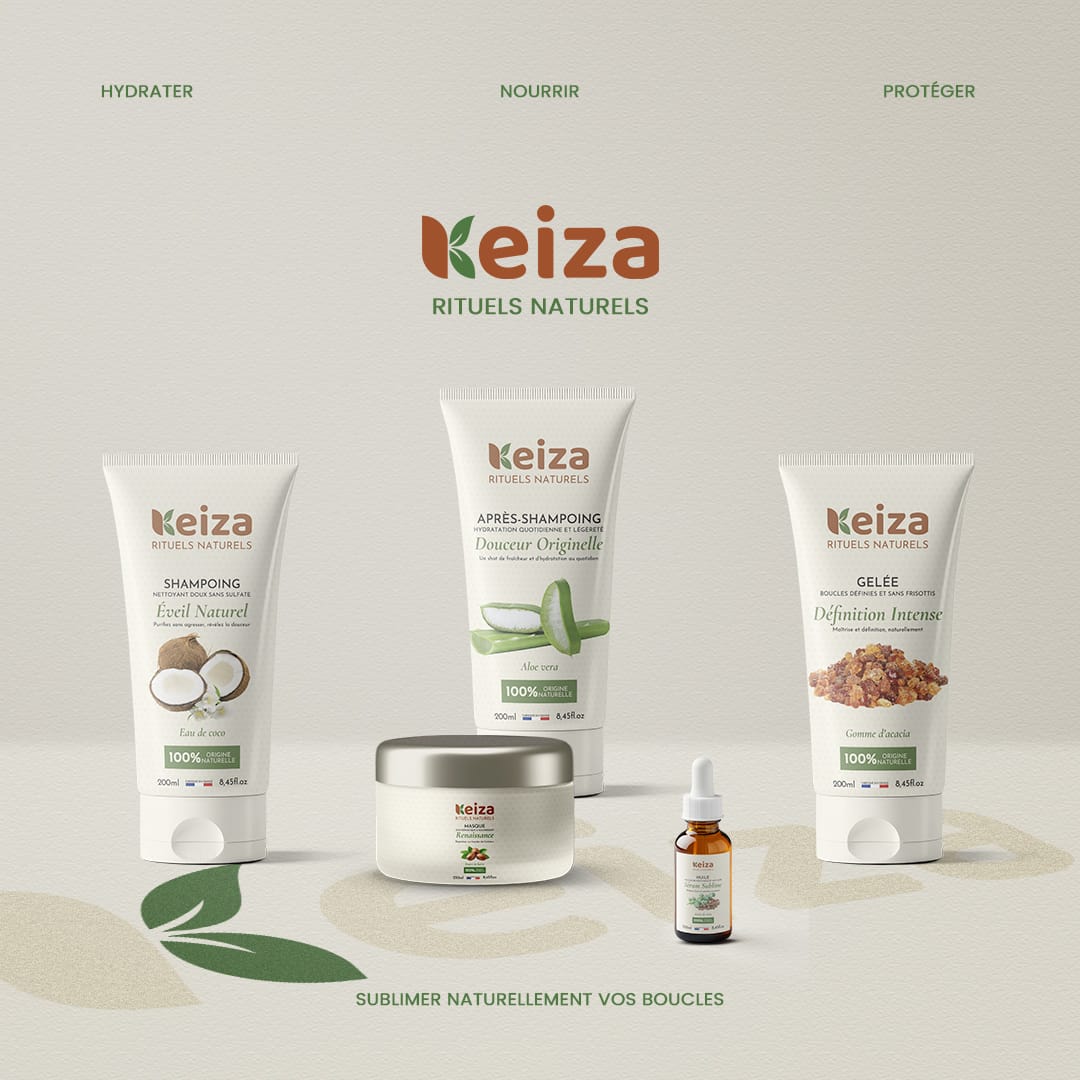 Création complète de la marque KEIZA, spécialisée en soins capillaires naturels pour cheveux texturés.